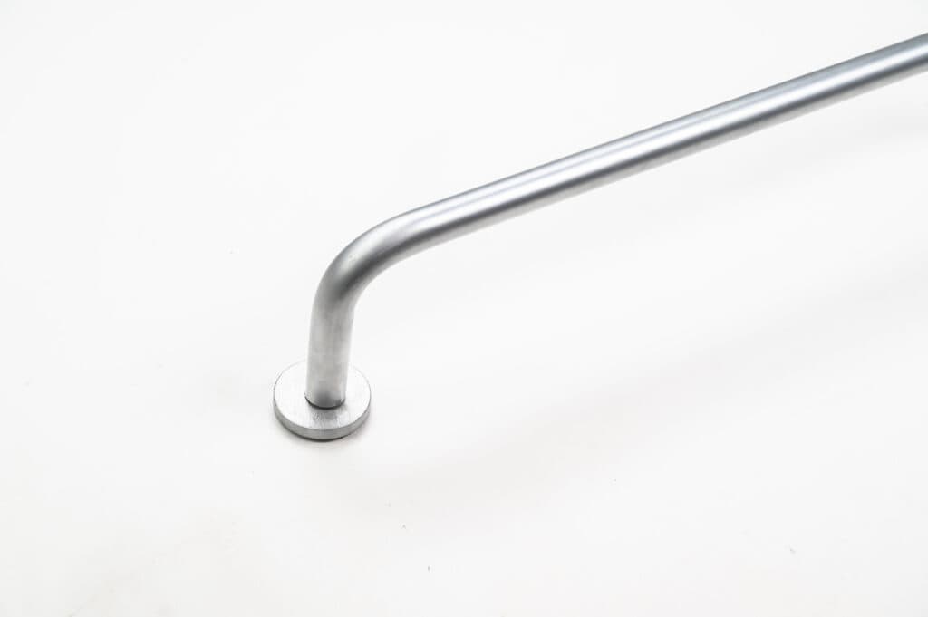 Stainless steel grab bar mounted on a white wall, with two visible screws on the mounting plate.